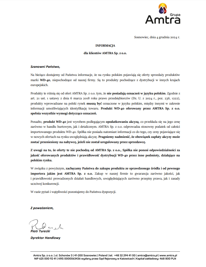 Informacja dla klientów AMTRA